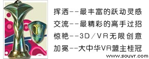 众多高手同台竞技,无限创意激情碰撞,“2009大中华区VR盟主选拔赛”为你提供最广阔的舞台,让你大展身手,成就梦想!用你的才华,用你的创意,用你的实力来证明,你就是当之无愧的VR盟主!挥洒汗水,抒写辉煌,今年的历史,由你来记录!