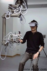 近年来,触觉方式在高级多模式远程控制(Telepresence或Telemanipulation,亦称“网真”)以及虚拟环境应用领域中的作用得到了越来越多的关注。除了多媒体(三维立体图形和立体声学)方式以外,触觉作为人机交互中最重要的方式之一,通常涵盖人的运动知觉、触摸感觉、以及对温度的感应力 运动知觉反馈设备可以为操作人员提供机械的作用力及扭矩反馈信息。这些信息通常是远程操控环境的测量数据,也可以根据虚拟物体之间的交互动作通过“虚拟现实触觉处理引擎”计算得出。目前,触觉设备已在不同领域中成功运用,包括远程遥控手术、医疗及手术虚拟现实系统、病患康复、远程及显微操控、远程维护、虚拟原型制作、科研视觉化、以及教育等。为了研制一款可以在大空间内完成高作用力任务的触觉设备,慕尼黑工业大学自动控制学院设计发明了ViSHaRD10超冗余触觉显示设备(10驱动自由度虚拟场景绘制设备),适用于虚拟现实及远程控制领域。同时,为了增强操作人员对远程或虚拟环境的感应,系统还配备了头盔显示器供操作人员使用。 下图为操作人员在使用“超冗余触觉显示器”进行触觉交互: