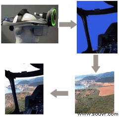 位于美国加州蒙特里市的海军研究生院下属的“模型制作、虚拟环境及模拟学院”(简称:MOVES)使用NVIS公司的头戴显示装置对虚拟训练系统进行评估。该系统采用基于Chroma Key的增强现实技术将运载工具引入训练平台。 运载工具(此例中为直升机)的宽屏幕由Chroma Key素材覆盖。训练人员佩戴的头盔显示器上安装有摄像头,可以提供Chroma Key前景图像。该图像与计算机生成场景相融合。由跟踪器监测到的计算机场景和操作人员的观察方向一致。摄像头中的图象符合Chroma Key颜色的区域(宽屏内或视窗以外)将被计算机生成图像所取代。然后系统将合成的图片通过头盔显示器展示给操作人员。当操作人员观察直升机窗口外的区域时,将会看到计算机生成的环境图像。而操作人员视域内的图像与实际观察的图像完全相同。 头盔显示器上的摄像头可以捕捉机舱内部的场景,并在屏幕的蓝色窗口内显示,视频混合Chroma-key硬件会把虚拟图像整合到窗外模拟场景的蓝色区域中。
