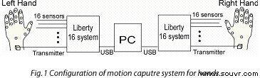 系统设计 图1显示了手部动作捕捉系统的构成。磁力跟踪器由一个发射器(23 * 28 * 16毫米)和16个接收器(9.6 * 9.6 *9.6毫米)组成,可以记录发射器到接收器之间的距离(xyz坐标),还可以记录接收器与发射器的相对角度(方位角、仰角、转动)。系统会对每个接收器进行调整以符合手指的状态。每根手指配有三个接收器进行测量,手背一个接收器,每只手共使用16个接收器。此外,我们对适配装置也进行了改进,添加了弹力布带,可以适应任何手型尺寸。接收器用弹力胶带和液态塑料固定在手指上,可有效防止接收器滑落。两套LIBERTY系统通过USB端口与电脑(IBM的ThinkPad)连接。手部动作捕捉系统可同时测量出32个接收器的六自由度数据,测量频率为240赫兹,空间分辨率为0.0038毫米,角度分辨率为0.0012度。