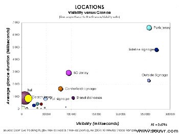研究显示出,在一些位置出现的商标被看到的人最多,而且这些商标也最容易被回忆起来。商标位置分析显示出哪些位置获得的商标注视时间(BGD)最长:位于球衫上的商标可见度最强获得的商标注视时间也最长。球衫两侧和中央区域看到的人最多,能够回忆起来的人也最多。