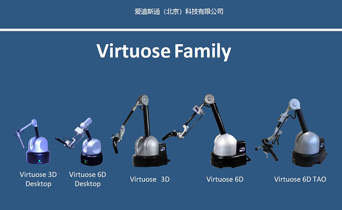 其中,Scale1是带有一套自动跟随电动马达移动平台的Virtuose 6D力反馈平台,它是一套超大型工作空间的力反馈装置,Scale1可完全依照使用空间、显示屏幕或CAVE的尺寸予以定制;Virtuose 6D Desktop是一个6主动自由度的力反馈设备,非常适合在桌面屏幕、HMD虚拟头盔或模拟器内使用;Virtuose 6D是一款高强度6主动自由度的力反馈设备,专门为虚拟现实环境的力反馈交互而设计。