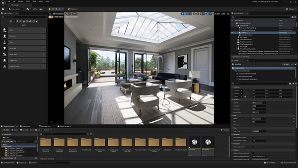 当一切都创建完成,下一步就是将模型从3ds Max转移到Unreal Engine。“使用DataSMIth插件非常容易,它可以正确地将所有网格从从3ds Max导出到虚幻引擎,而不需要太多优化,”Hegazy解释道。“然后,我们使用SunSky在虚幻引擎中精确设置太阳的位置、亮度和色调。在此之后,我们使用蓝图功能为体验我们虚拟博物馆的人们创建了大量的可互动选项,如行走、跳跃或改变一天内的时间等。这意味着我们可以在不同的照明条件下提供更丰富的空间体验,而无需编写C++代码。”