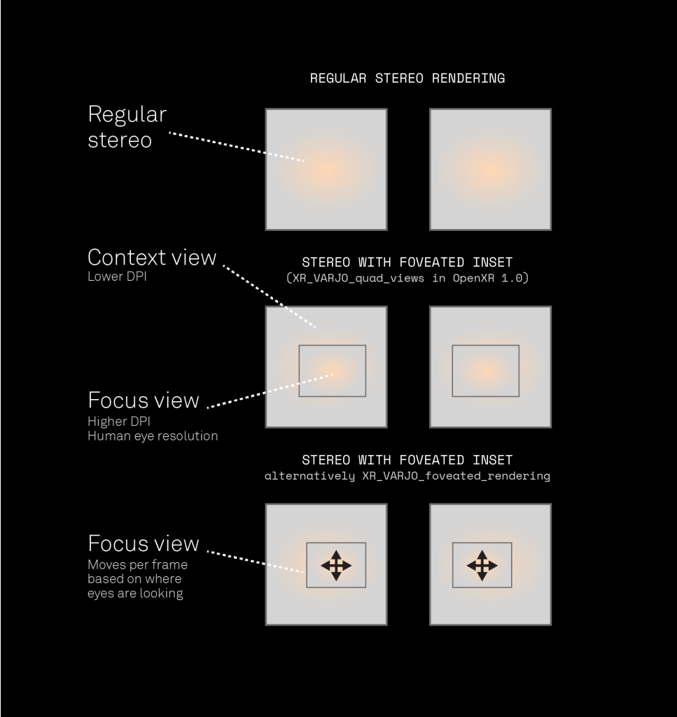一个常见的误解是,XR_VARJO_quad_views和XR _ VARJO _ foveated _ rednering只会让像我们的XR-3和VR-3这样有四个物理显示器的设备受益,但这并不准确。它在Varjo Aero和XR-4上确实有好处,因为每只眼睛有一个物理显示器,因为四视图和中心凹渲染是在Varjo的OpenXRruntime中实现的一种通用软件技术,它对物理显示器进行逻辑分区,无论它们是两个还是四个。