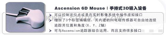 6D Mouse为成本低廉的定位设备,可与Ascension追踪器结合运用,而且支持很多接口,除此之外,还增加了3个标签编辑钮,其内建的DC电磁传感器可自由地连续追踪其位置和角度(X、Y、Z轴)。用户可以像使用3D鼠标一样进行使用,去控制定位点或是在实时影像系统中操作虚拟接口。