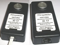 HX17T是一款超声波发射器,可以定期发射超声波辨识信号。传输触发频率可以在设备正面底孔处选择。用户可以使用牙签或其他类似工具点触按钮从而选择触发频率。配有LED指示灯可以显示传输速率。用户按下底部按钮后,LED灯会闪烁,如果用户持续按住底部按钮,LED灯的闪烁速度会加快,而LED灯每闪烁一次,超声波ID都会传送一次。用户能够听到设备上超声波发射器的嘀嗒传输音。Hexamite提供了少量Hx17超声波标签供用户使用。