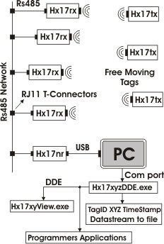 HX17网络由三个基本组件构成,包括hx17rx超声波接收器、hx17tx超声波标签、hx17nr网络读取器。HX17nr能够同步网络并收集标签的ID以及超声波信号的发射时间。数据通过USB端口传送到电脑等读取设备中。系统附带的光盘程序可以计算并存储标签位置,并可通过直接数据交换软件界面将处理过的实时数据提供给程序员使用。以直接数据交换传送的数据串包含标签ID、XYZ位置(以毫米为单位)、时间戳记、记录编号以及哪些接收器检测到了标签的超声波ID。Hexamite配有平面浏览程序用于演示。