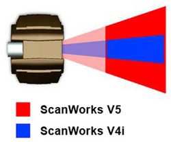 除了具备V4i的低光及反光表面采集数据的功能以外,ScanWorks V5还具备其它功能,其中值得注意的是ScanWorks® V5的视域投影功能。传感器可以精确投射出视域的梯形图像,显示出扫描宽度和扫描偏距。这一功能使用户能够迅速熟悉扫描流程,减少了多余的重复数据。