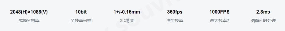 | 成像芯片 | 分辨率:2048× 1088 帧速:360 FPS 延迟:2.8ms 快门:全局快门 快门速度:-默认:250us(0.25ms)-最小:10us (0.01ms) 最大:2500us (2.5ms) @ 360FPS |
