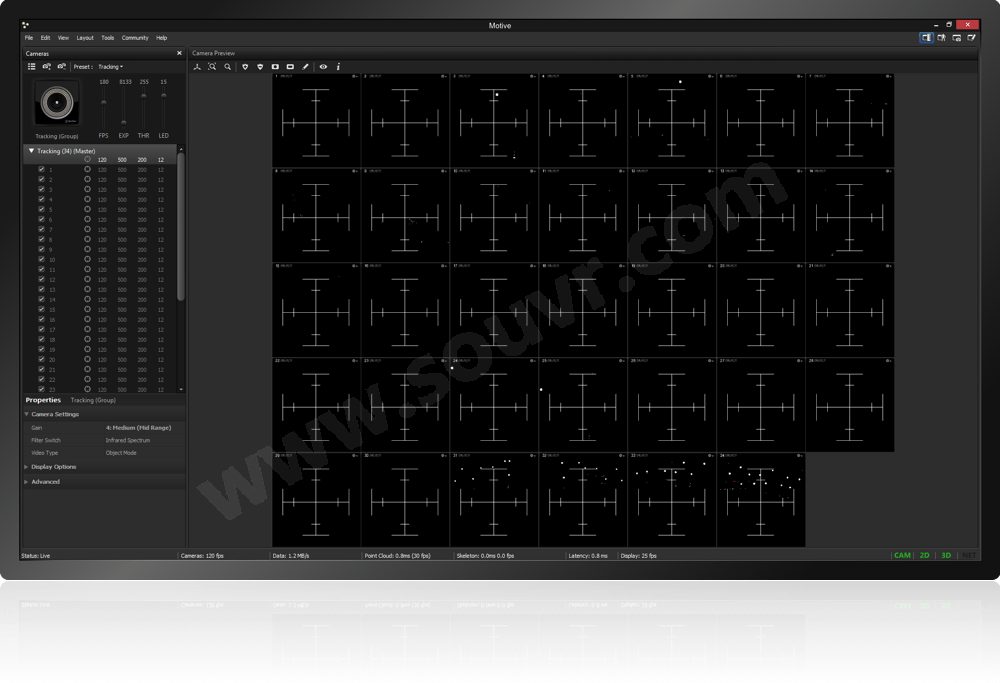 所有Primex摄像机均可选作参考视频记录源,将标记点、刚体、人体骨骼等动作捕捉数据与红外摄像机精准地3D合并叠加,同步输出显示全分辨率全帧率的单色视频,有助于分析数据准确性和动作捕捉流程细节的改进。