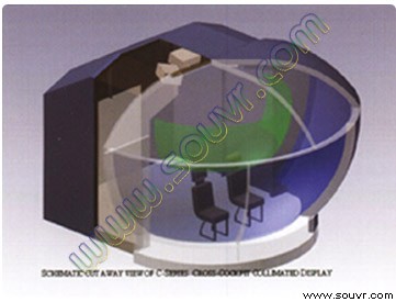 准直虚像显示系统,该显示系统有用高分辨率、低失真以及良好景深效果,典型应用的水平视场可达180度,垂直视场可达40度。准直虚像显示系统能够在不降低图像亮度和分辨率的情况下显示接近光学极限聚焦范围的图像。双座准直虚像显示系统正是基于光学系统存在一个很大的瞳孔的原理而设计的应用该设备。主要用于高质量的研究、评估和训练等场合。