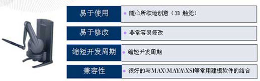 FreeForm触觉式设计系统,是第一套融合视觉与触觉来完成3D模型建构的系统。设计者只需要用手握住一支触控笔,来控制电脑画面中的雕刻刀,就可以真实的感觉到模型的存在,并快速且随心所欲的雕刻任何您想要的模型。这对一般的3D设计软件来说是一次全新的革命。