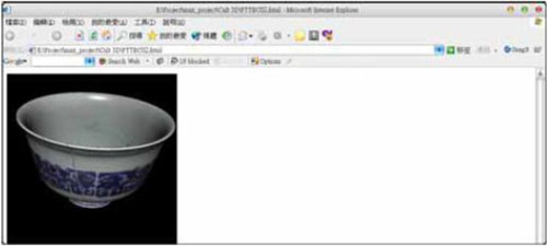 Cult 3d design 软件输出之co 文件具备有压缩率大﹝档案小﹞,可呈现呈现反射、凹凸、透明…等效果,可设定按钮触发动作并与用户互动性高,可放于WEB 网页上以供大众浏览等优点,故使用此输出档为虚拟环境的输出规格,web 网页效果呈现如下图9 所示