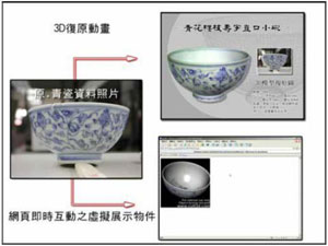 藉由3D 动画及网页展示技术,将破损之收藏品,以全新并完整的面貌呈现;而透过互动接口的设计,更可以自由切换修复前后的样貌,提供观赏者不同的视觉体验。
