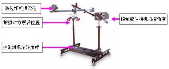 为拍摄环物影片,本馆使用Magellan2000 影像3D 模型拍摄人工操作机架,此机架针对拍摄环物影片而设计,将欲拍摄的对象放置于中间的圆盘中,其下有旋转枢纽,可控制放置对象的圆盘旋转角度,其旁有倒L 型横杆直通道圆盘的顶部,可放置数字相机,并控制数字相机拍摄角度﹝如下图3﹞。