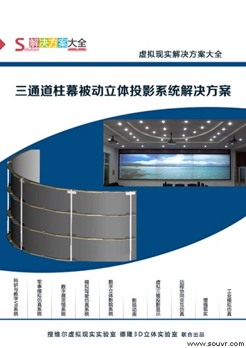 本方案由搜维尔VR实验室推出。三通道柱幕被动立体投影系统是一套3D虚拟环境可视化系统,主要是利用先进的计算机软硬件系统、大屏幕投影系统为大型水利工程项目、虚拟战场仿真、数字城市规划、三维地理信息系统等大型场景仿真环境等领域提供先进的三维交互仿真环境和研究手段。